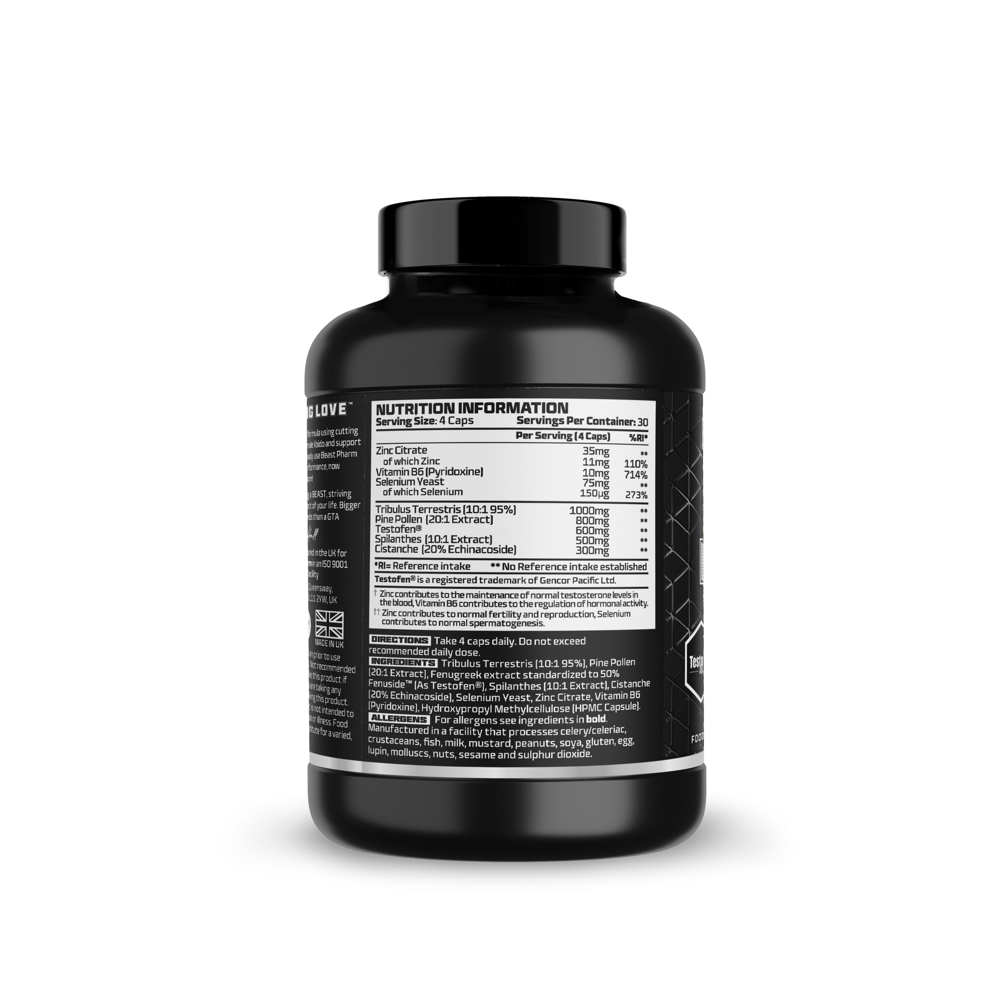 Tribulus Terrestris (10:1 95%), Pine Pollen (20:1 Extract), Fenugreek extract standardized to 50% Fenuside™ (As Testofen™), Spilanthes (10:1 Extract), Cistanche (20% Echinacoside), Selenium Yeast, Zinc Citrate, Vitamin B6 (Pyridoxine), Hydroxypropyl Methylcellulose (HPMC Capsule).