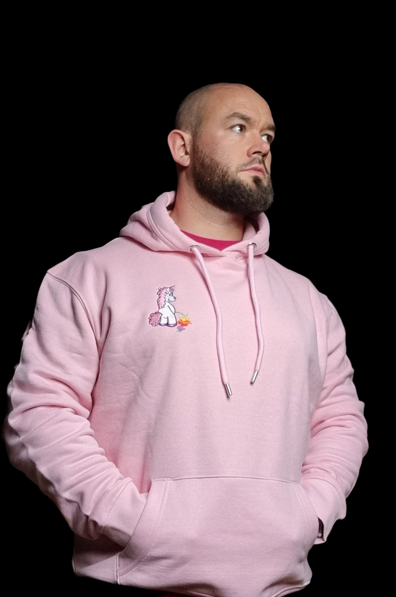 Upgraded and improved... Baby pink hoodie with embroidered Unicorn Piss logo..